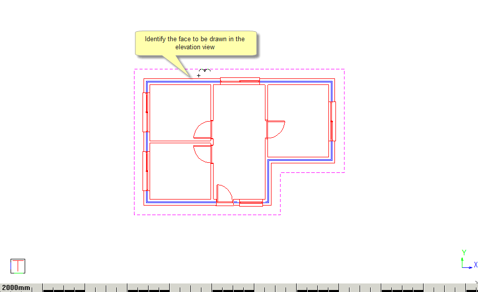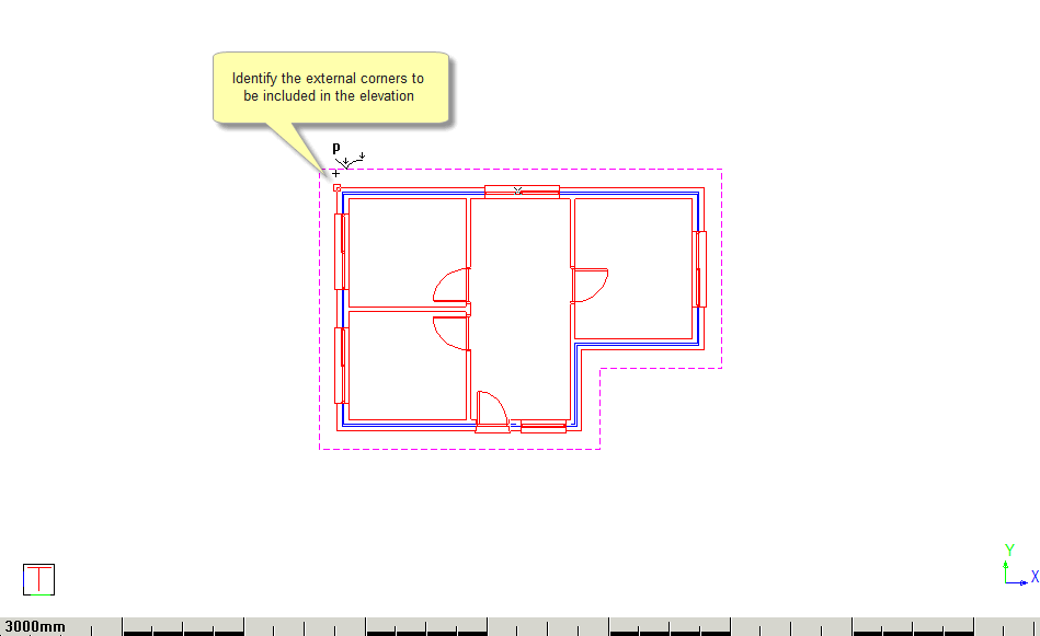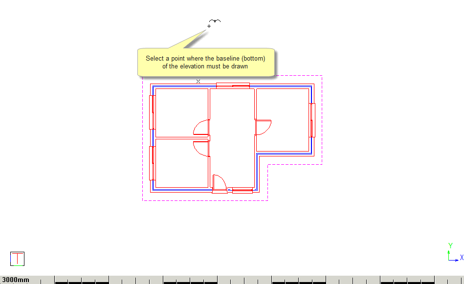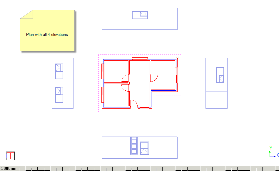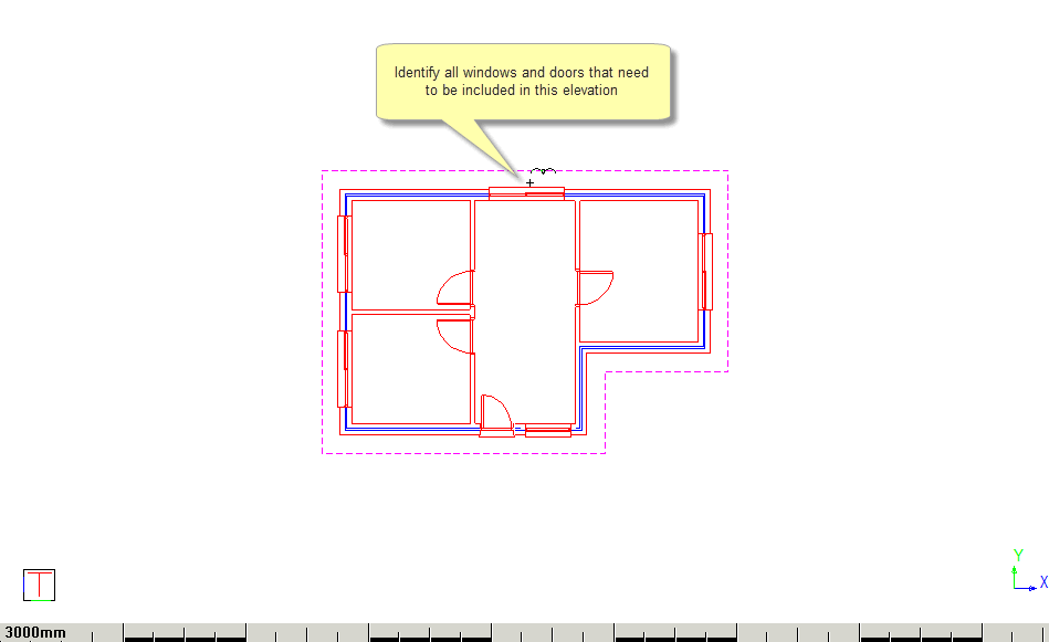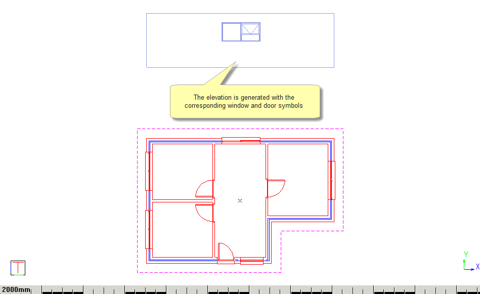 This function allows you to draw elevations once a plan view has been completed with windows, doors and roof line inserted. The eaves height, lintel height, line styles and layers are specified in the Design Settings.