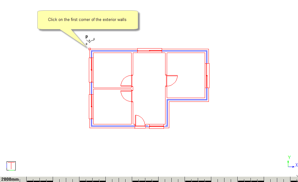 The cursor changes to point snap mode. Click on the first corner of the external walls as shown below: