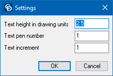 Enter the text height, the text pen and the value by which the subsequent text strings differ. A negative number causes the text strings to decrement rather than increment.