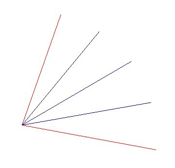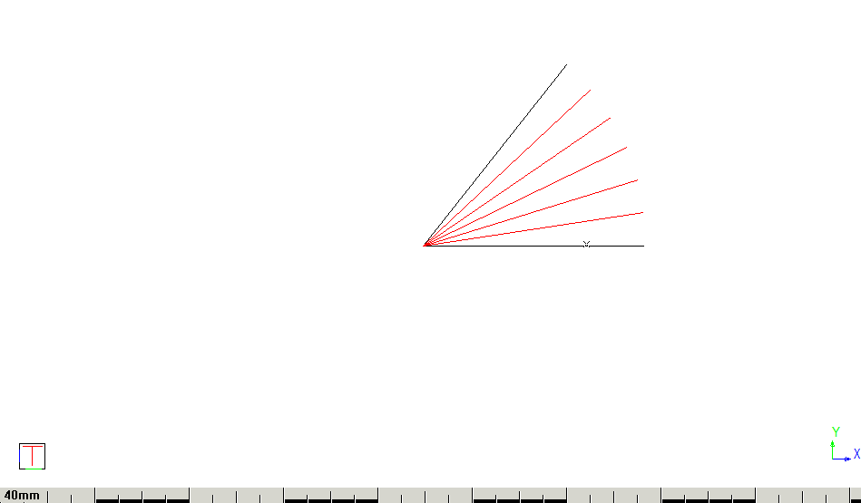 This function allows you to divide an angle formed by two lines into a specified number of equal angles. In the example below, the angle between the outer two lines has been divided into four equal sections.