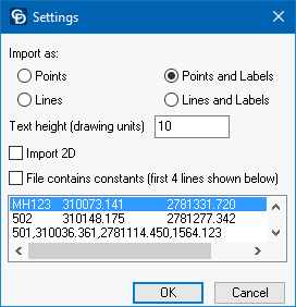This function allows you to import a file of survey coordinates and add them to the drawing in the following forms: