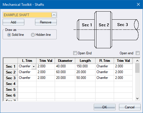 This function allows you to draw a predefined shaft, or specify and create a new shaft definition.