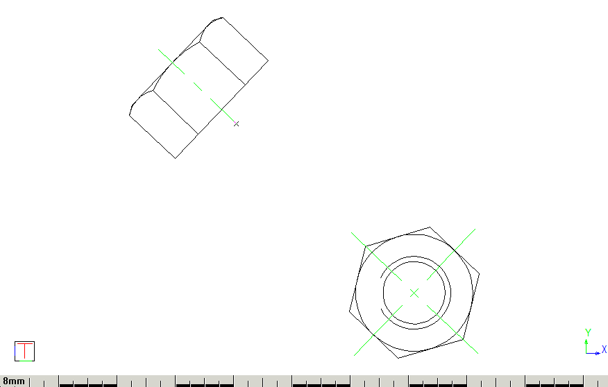 Cursor hold is active at this point, which allows you to specify a position for the plan view of the nut that is aligned with the axis of the nut side view. Indicate a centre point for the plan view.