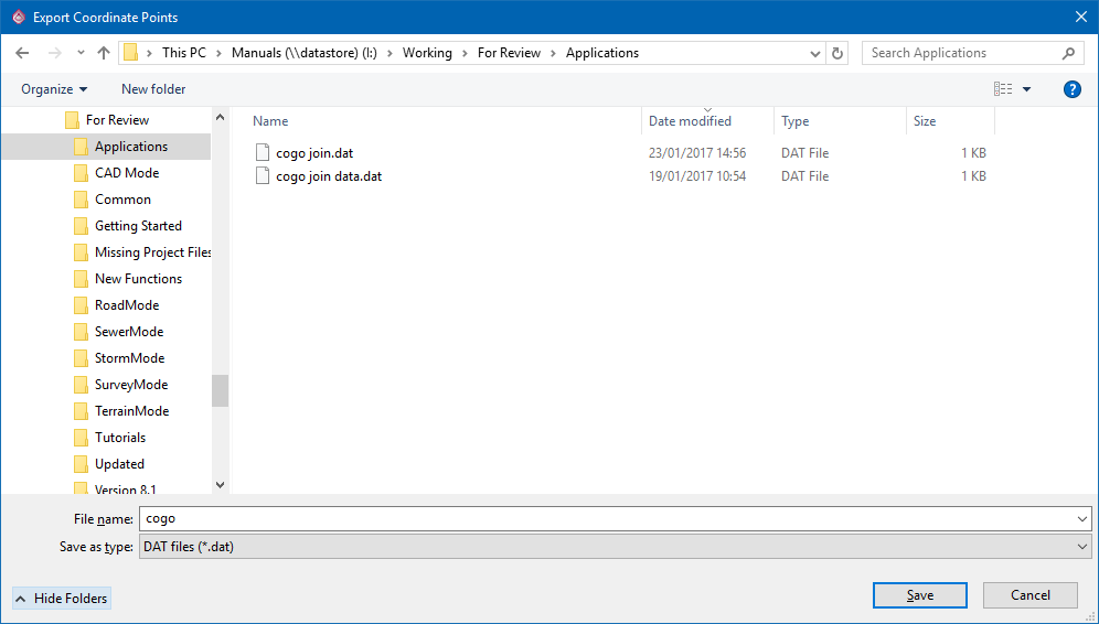 This function allows you to export all the coordinate (COGO) points in the drawing. The format of the exported file is comma-delimited with the following data: