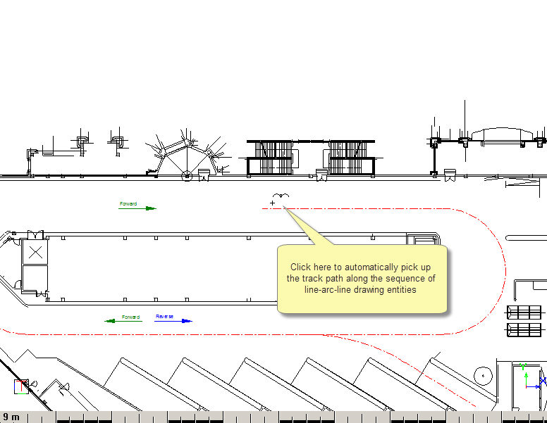 A tracking path is the path that is used in simulating vehicle movement. This path can be defined by drawing lines and arcs in CAD. There are, however, a couple of guidelines to follow when doing this: