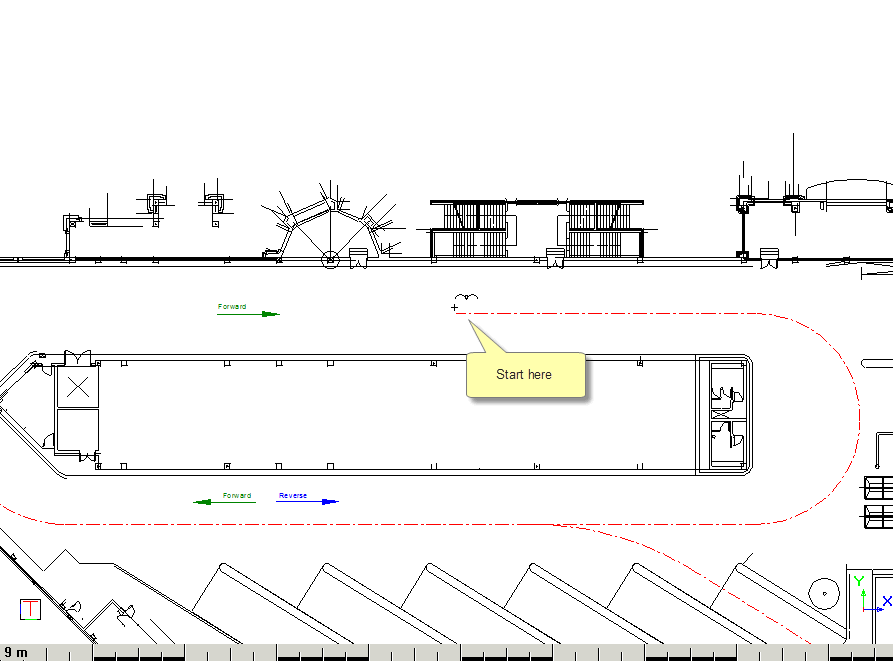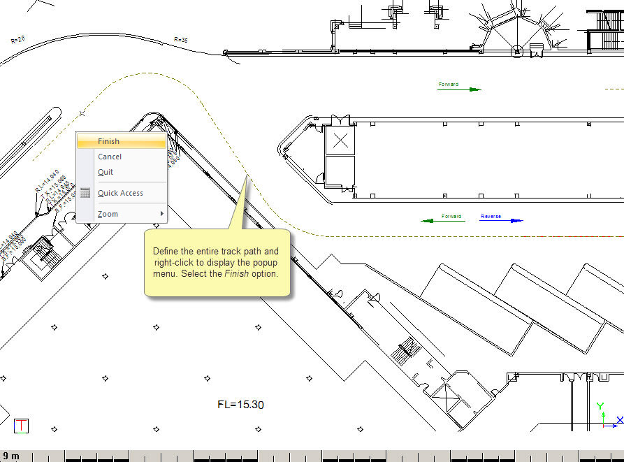 A tracking path is the path that is used in simulating vehicle movement. This path can be defined by drawing lines and arcs in CAD. There are, however, a couple of guidelines to be followed in doing this: