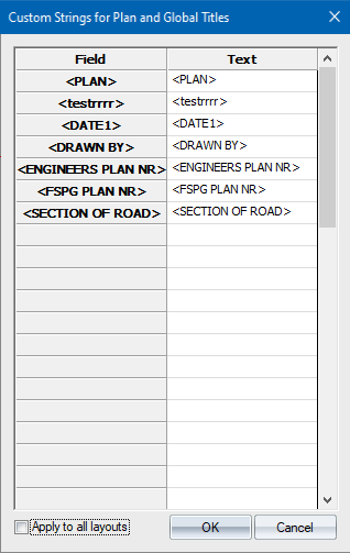 If there is Custom Global or Plan Text in the brackets (<>), the Custom Strings for Plan and Global Titles dialog displays.