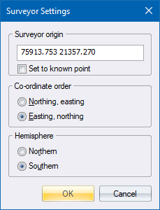 Select the required hemisphere for the surveyor drawing. Changing hemisphere will automatically alter the coordinate order, and will also alter settings for the Angular format in the Drawing Settings.