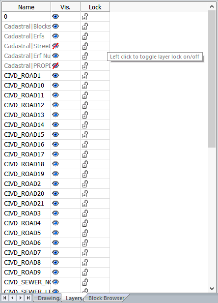 Layer visibility and lock status can be changed by clicking on the relevant icon in the list.