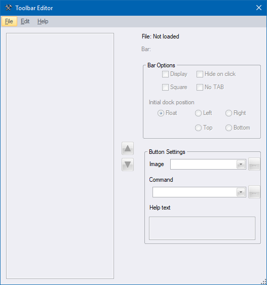 User-defined images must be supplied in an .ico (icon) file in True Colour + Alpha Channel (32 bit) format. The icon file must contain two icons, the first being 16 pixels wide by 16 pixels high, and the second 24 pixels wide by 24 pixels high. Tthis allows us to easily support two sizes of toolbar - standard and large. Use the alpha channel to define areas in the images that must be transparent when displayed on a toolbar. There are many good icon editors available.