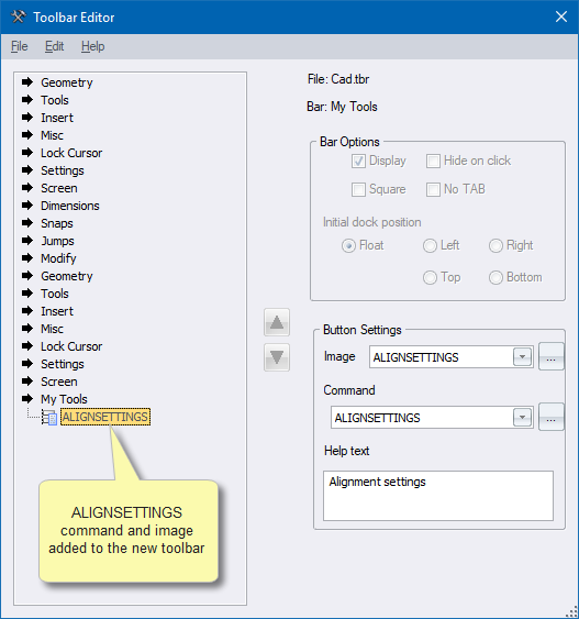 A specialised, called the Toolbar Editor, is available for changing toolbar files and can be found under the Tools menu of the AllyCAD Start Menu folder.