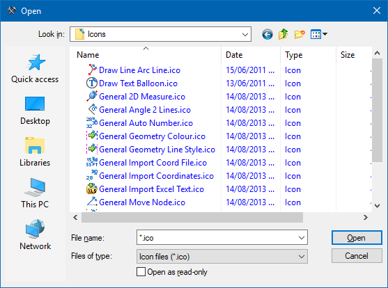 - The Open dialog opens so you can browse to a folder that contains icons that have been previously created.