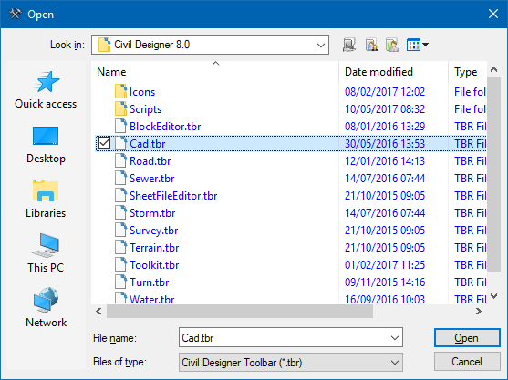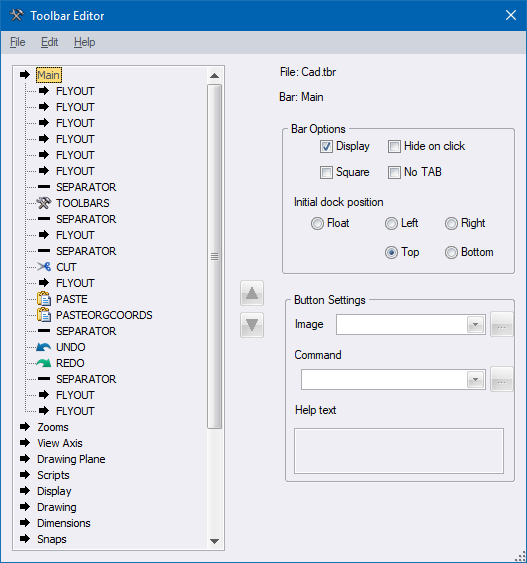 - Select the cad.tbr file and then click Open. The toolbar file opens in the editor and displays as shown below.