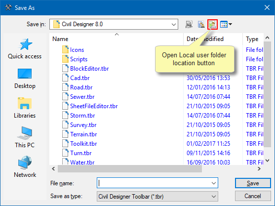 - Click Open Local user folder location and save the toolbar file as CAD.TBR, which is the same name as the original toolber file. Now click Save.