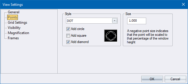 Enter the size of points in drawing units. If the size is 0, points will drawn approximately 10% of the height of the window. If the size is negative, points will drawn as that percentage of the height of the window. |