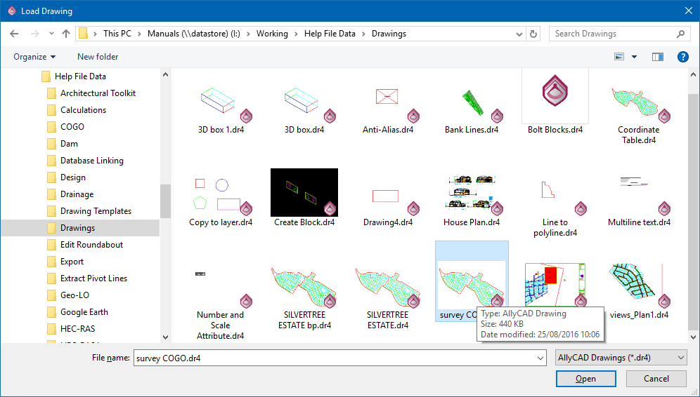 Use the File Filter dropdown list to select the type of drawing files to display. The following file formats are supported: