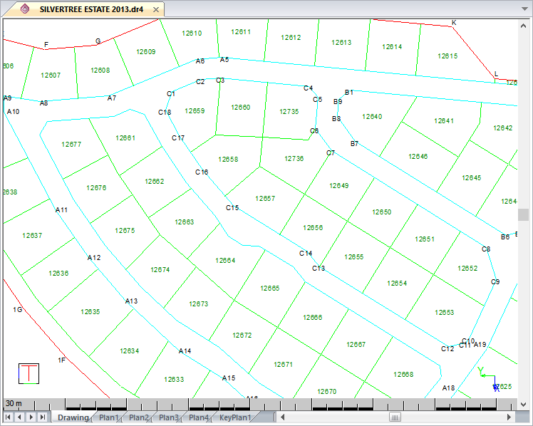 Here is a drawing in AllyCAD drawn in Surveyor mode. You now load a drawing onto this, which is also drawn in Surveyor mode. If both drawings are in Surveyor mode the drawing is loaded relative to the coordinates on each drawing i.e. the loaded drawing is automatically correctly geo-referenced.