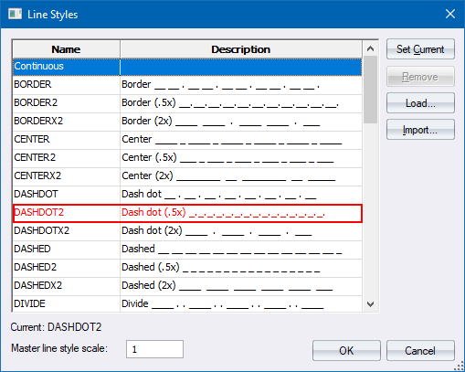 The Current line style in use in the drawing is displayed in the bottom left of the window. It also displays in red text in the line styles list.