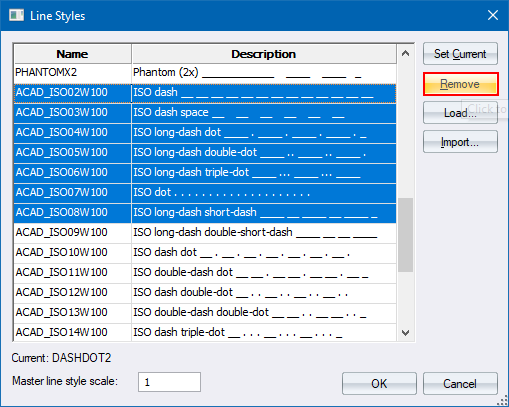 Select the line style to be removed in the line styles list. You can press [Shift] to select a range of objects; or press [Ctrl] to add individual objects to the selection.