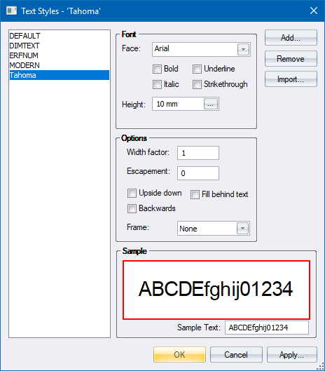 In the example below, the font is specified as Tahoma and the text height as 10mm on paper using the annotative text option. As you change the text style, the Sample window will be updates.