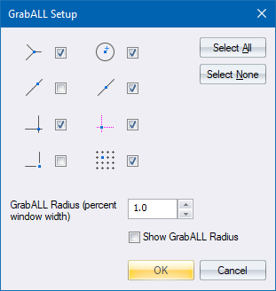 This Snap Mode snaps to several types of snap points, depending on which snap modes have been enabled in the GrabAll Setup settings.