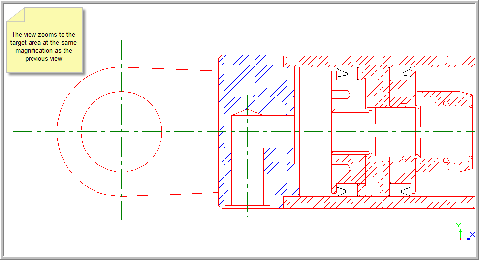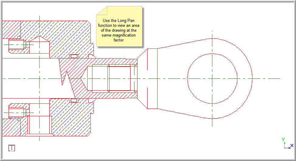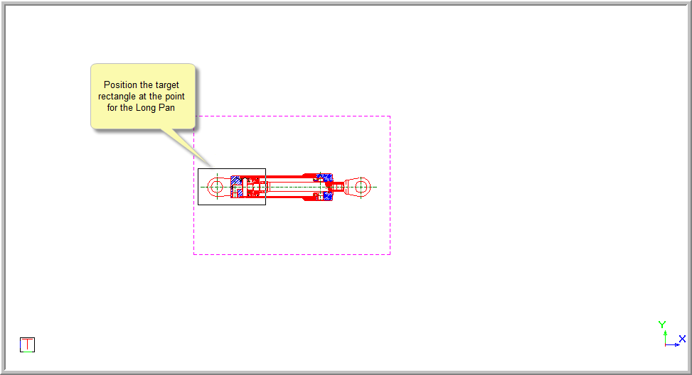 This function allows you to pan to an area of the drawing at the same magnification factor, using a "birds eye view" of the entire drawing and a target rectangle to specify the pan target. Use the Long Pan function if you have zoomed the drawing and would like to view another part of the drawing at the same magnification factor.