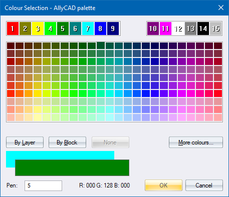 Click to set the pen colour to By Block. Entities drawn with the By Block pen display in the colour of the Block Insert which references the block. If the entity is not part of a block, it will be drawn using pen 7. |
