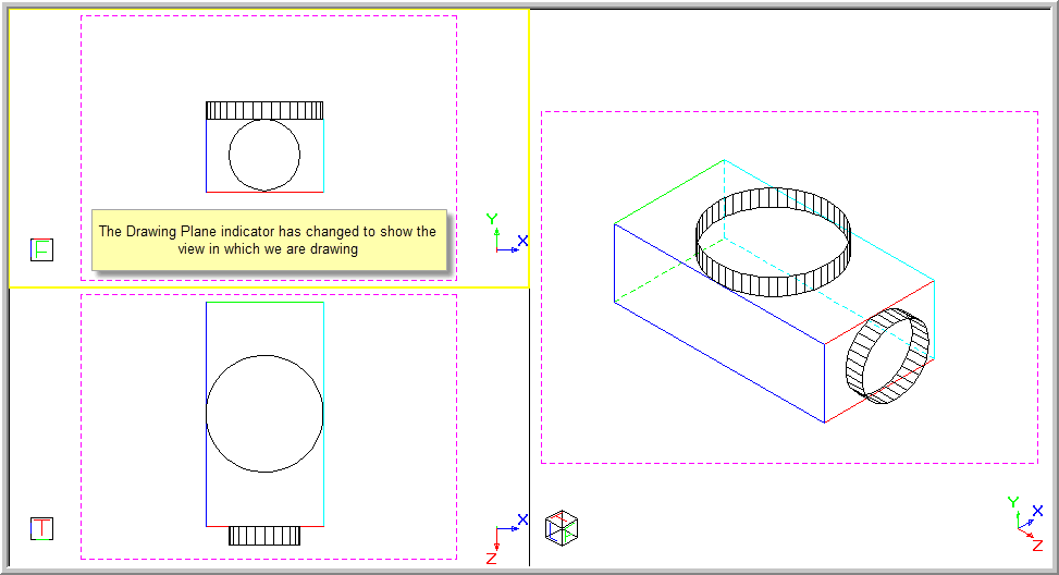 The top left view has now been activated. A cylinder is drawn and appears in the top view as that is the current drawing plane direction for the active view.