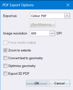 Select whether to export as a Colour PDF, Monochrome PDF or Greyscale PDF or Use Print Pen Mapping. |