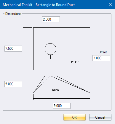 Enter the relevant dimensions, in drawing units, to be used when drawing the duct. Note that the Offset is the distance from the centre of the rectangular portion to the centre of the round portion. Specify a value of 0 for a symmetrical rectangle to round transition. |