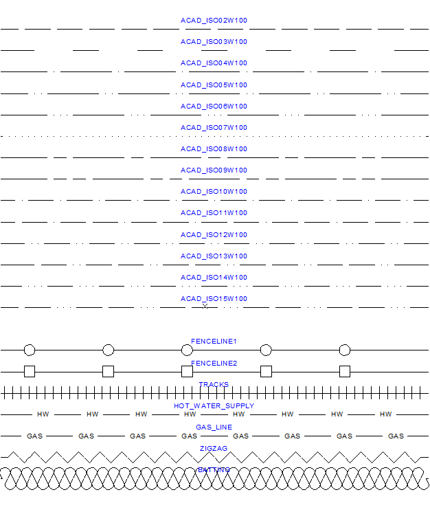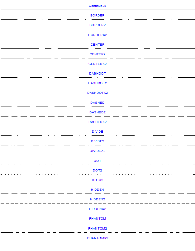 The following line styles are included in the standard CAD.LST linestyle file: